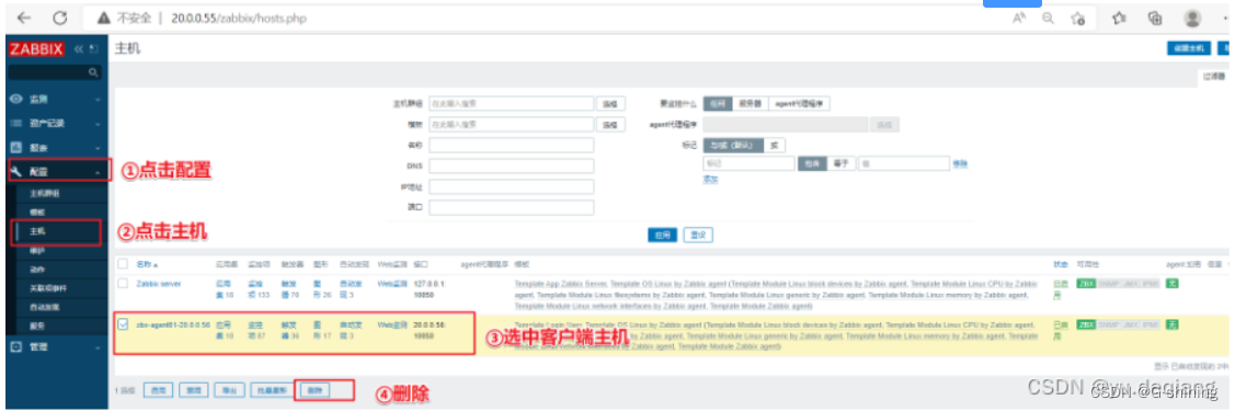 点击左边菜单栏【配置】中的【主机】,勾选原有的客户端主机,点击 删除