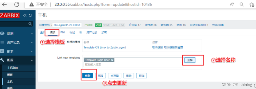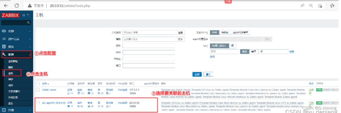 点击左边菜单栏【配置】中的【主机】,点击你要关联的主机