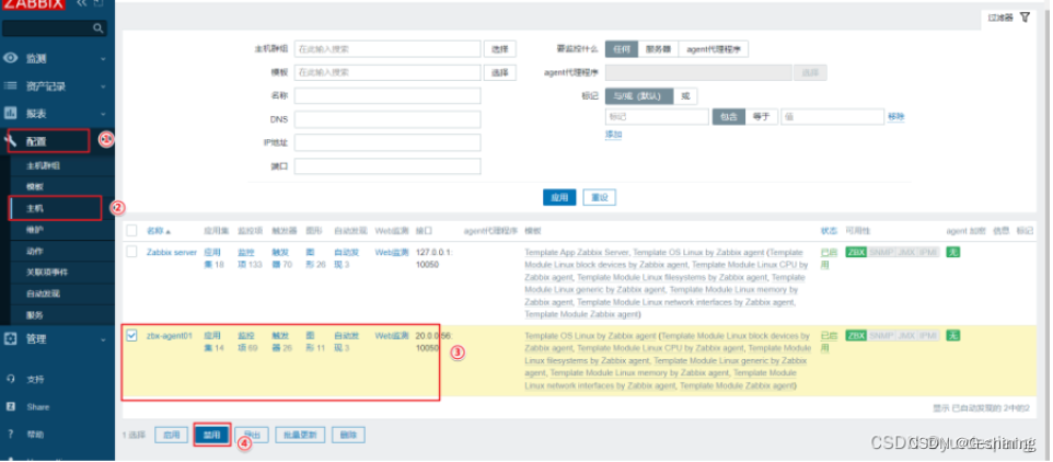 - 点击左边菜单栏【配置】中的【主机】,勾选原有的客户端主机,点击 删除