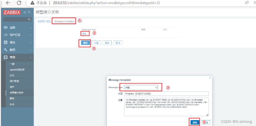 点击上方菜单栏【Message templates】,点击【添加】,【Message type】选择 问题,点击【更新】