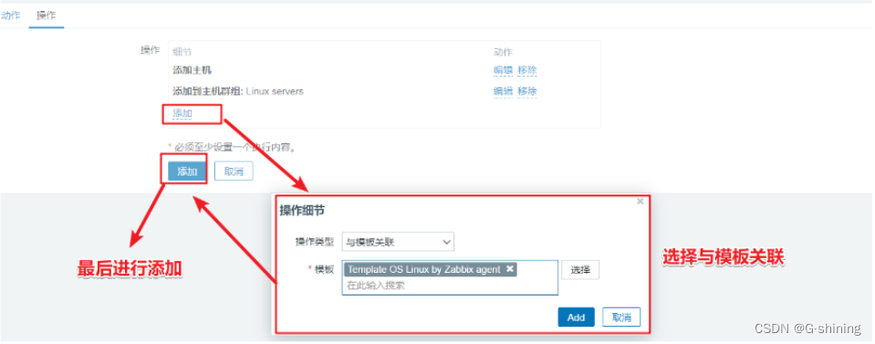 再点击【添加】,【操作类型】选择 与模板关联,【模板】搜索 Linux,选择 Template OS Linux by Zabbix agent,点击 【add】