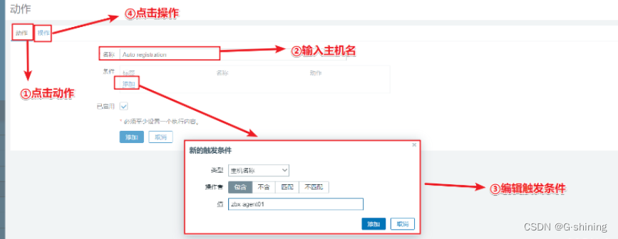 点击 【添加】,【类型】选择 主机名称,【操作者】选择 包含,【值】设置成 zbx-agent01