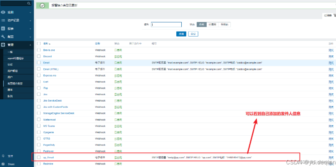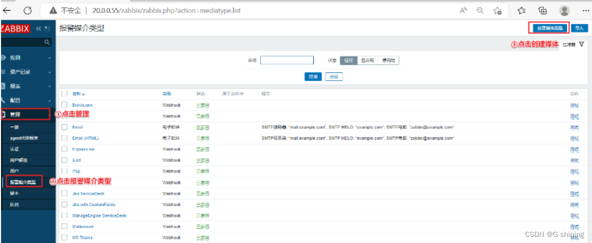 点击左边菜单栏【管理】中的【报警媒介类型】,点击【创建媒体类型】