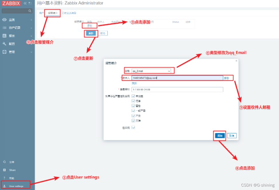 点击左边菜单栏【User settings】-->【报警媒介】,点击【添加】