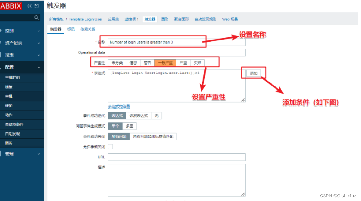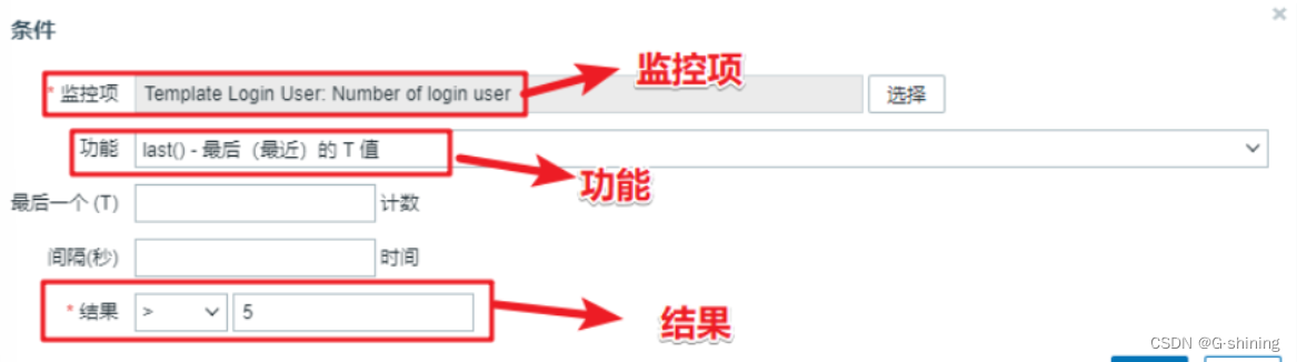 【表达式】点击添加,【监控项】点击选择 Number of login users,【功能】选择 last(),【结果】选择 > 3,点击 【插入】