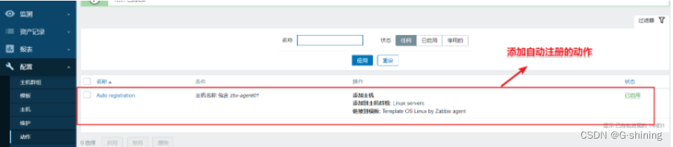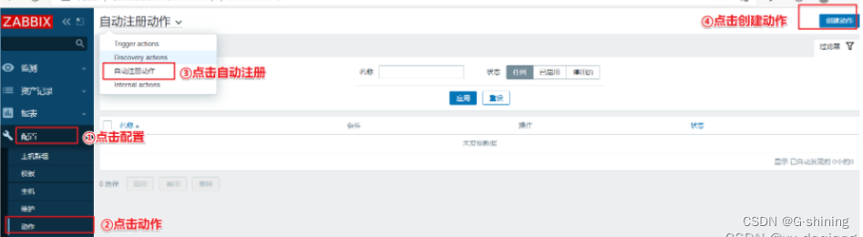 点击左边菜单栏【配置】中的【动作】,上方菜单选择 【Autoregistration actions】,点击【创建动作】