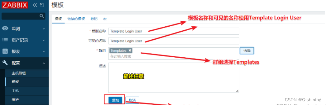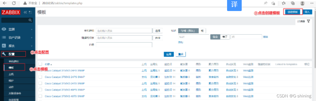 点击左边菜单栏【配置】中的【模板】,点击【创建模板】