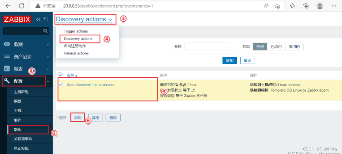 点击左边菜单栏【配置】中的【动作】,上方菜单选择 【Discovery actions】