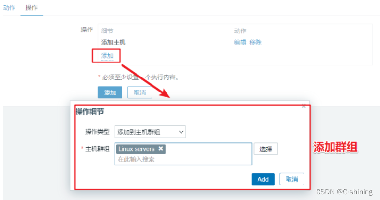 再点击【添加】,【操作类型】选择 添加到主机群组,【主机群组】选择 Linux servers,点击 【add】