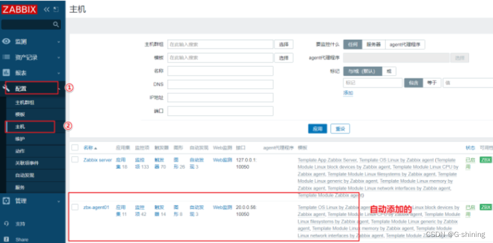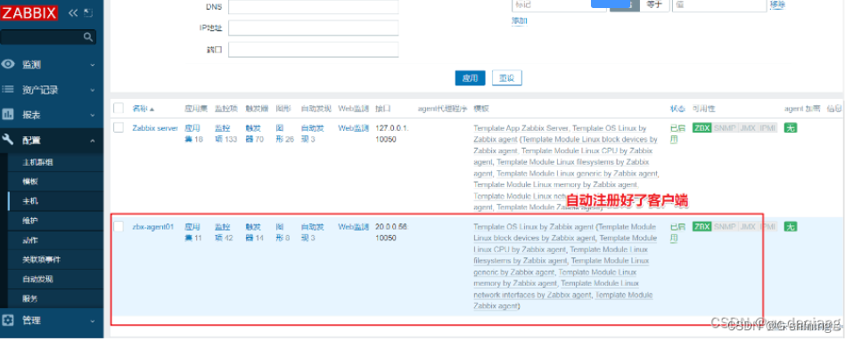 点击左边菜单栏【配置】中的【主机】刷新,等待一段时间后即可刷新出自动发现的客户端主机