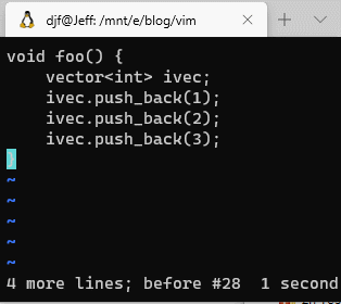 我们惯常使用的编辑模式,对应到VIM上,叫插入模式,普通模式下a,i,c,s等按键,可以达到切换到插入模式的效果,插入模式只能进行简单的编辑操作。这个模式下,按键是用来处理输入的,也没有太多快捷键,但是某些场景下可以与其它模式进行联动,加快输入的速度。
