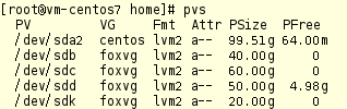 用pvdisplay和pvs命令可以看到各物理卷的使用情况: