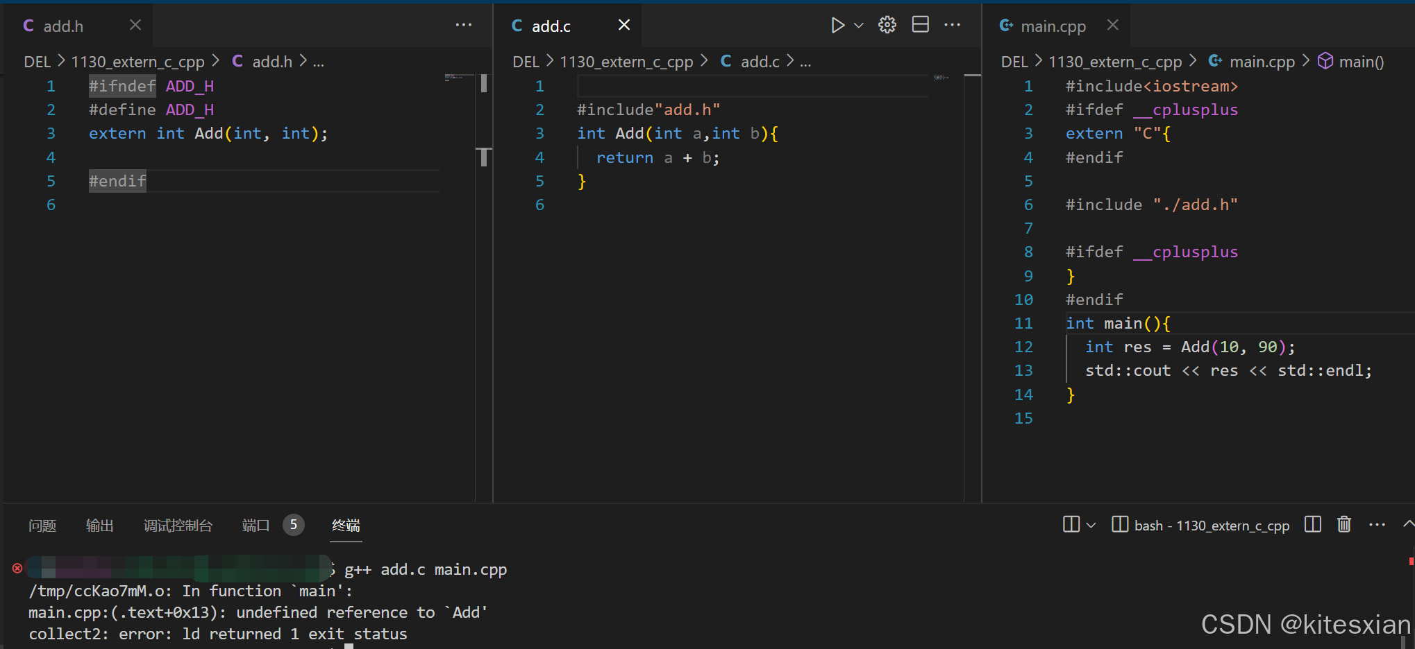 链接错误(未定义的引用),编译器找不到Add的定义,显然被g++给修饰了函数名,最终导致了link error。但这并不意味着我们的代码错误,因为在VS的MSVC编译器下成功了。
