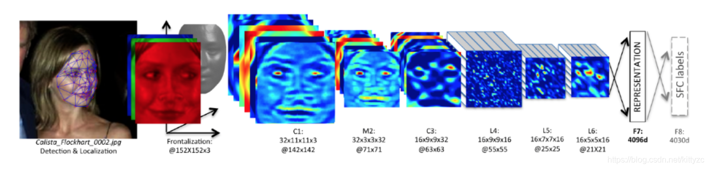 f7和f8是全连接层,这些层能够捕捉人脸图像中较远部分的特征之间的相关性,比如眼睛的形状与位置和嘴巴的形状与位置,f7层作为特征(4096D)。大约95%的参数来源于最后的全连接层。