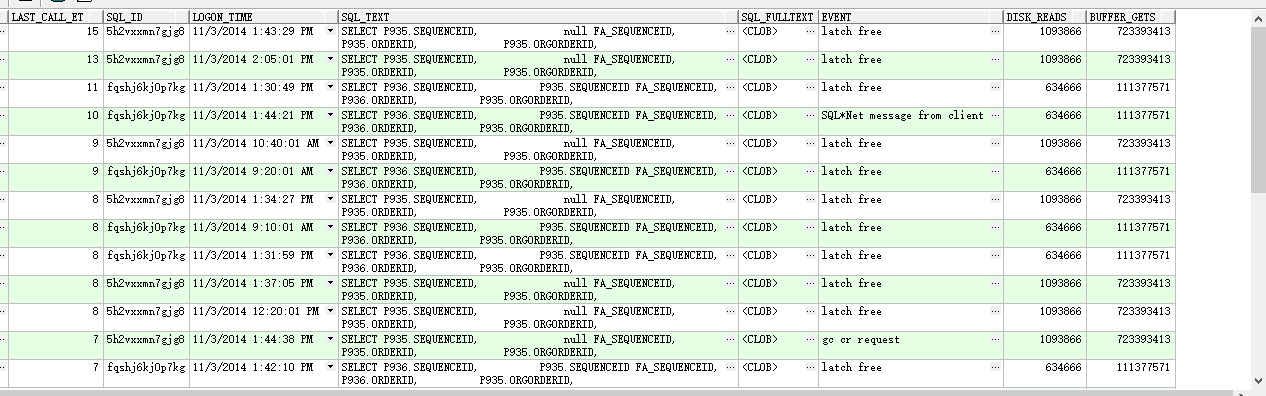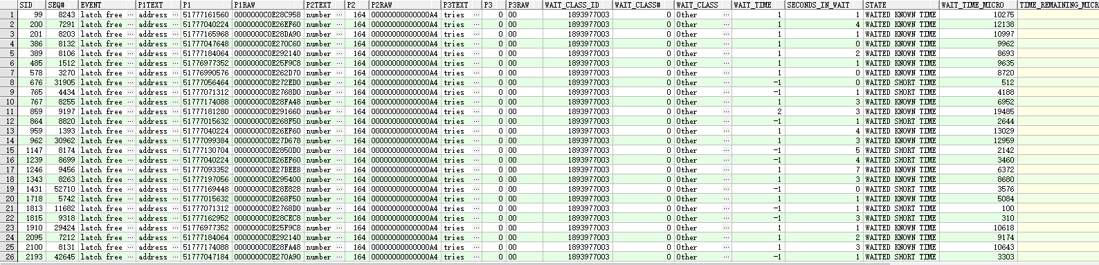 通过如下的sql语句,我们查看当时数据库的等待,争用的情况: