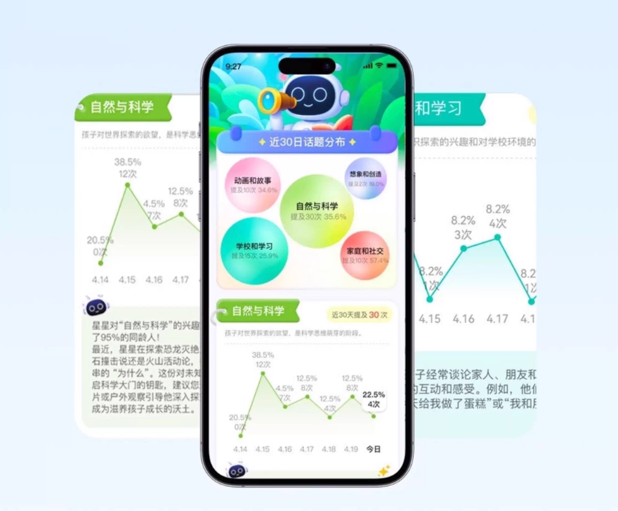 依托千知精灵AI能力,家长可通过小程序实时获知孩子感兴趣内容与话题,有助家长引导孩子成长兴趣发展,还能主动及时提醒异常情况,管理成长风险。