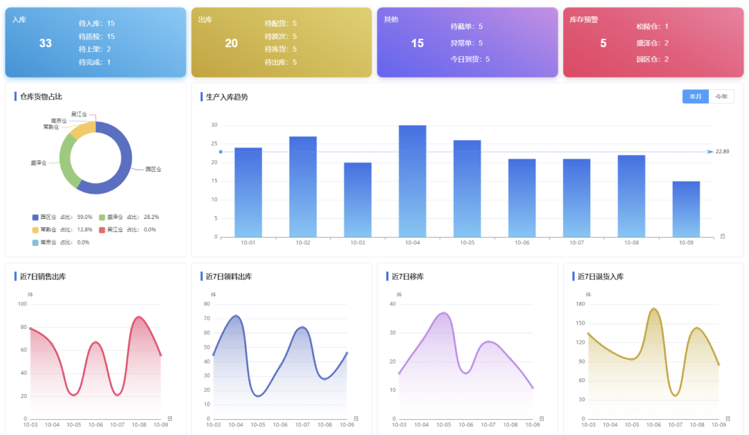 仓库管理系统WMS 经营看板可以帮助企业管理者直观地了解生产活动中仓库的使用情况。涉及到的指标包括库存、供应商等方面的数据,通过数据可视化、图表等方式呈现,对于仓储的科学化、可视化管理具有重要意。