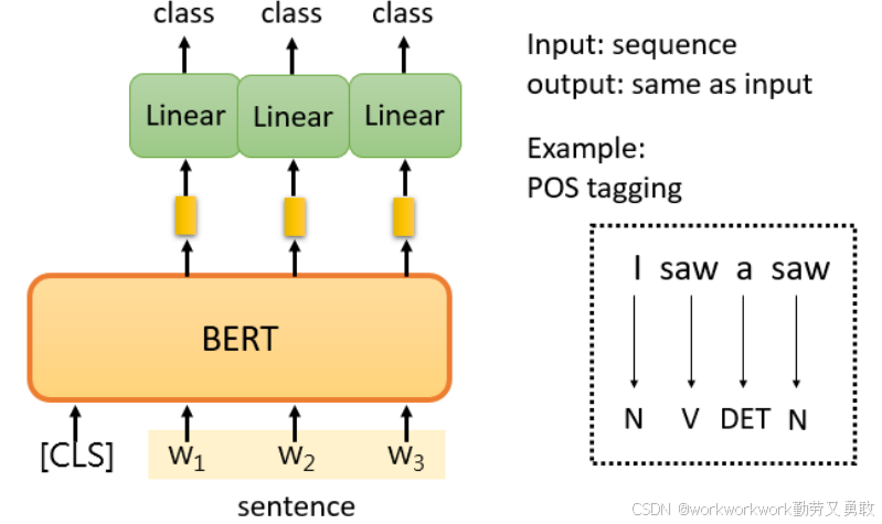 序列标注(例如词性标注 POS tagging):对 BERT 输出序列的每个向量分别做分类。比如做词性分类