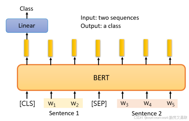 Next Sentence Prediction(NSP):给模型两个句子,让其判断第二句是否是第一句的“后续句”。具体做法是在这两个句子之间添加一个特殊标记SEP,这样BERT就知道这两个句子是不同的句子,在句子开头也会有一个特殊标记CLS,传给BERT后让它回答是/不是。