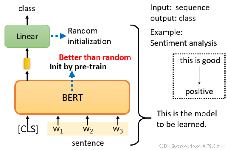 情感分析:在输入句子前加 CLS 标记,BERT 输出时只取 CLS 位置的向量,再接一个线性层做分类。在实践中,仍然需要提供标记数据,所以这其实是一种半监督式的学习,其中Linear transform的参数是随机初始化的,BERT的参数是学会填空的BERT初始化的。