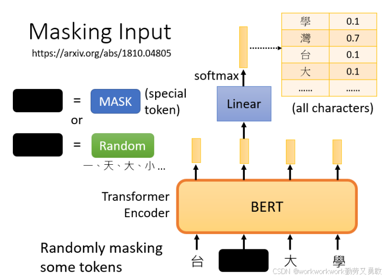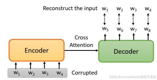 前面提到,BERT 是 Transformer 结构的 Encoder,那么Decoder怎么训练呢?方法是这样的,transform的架构中,Decorder中的 Query(来自自身产生),Key 和 Value(来自 Encoder 的输出),通过故意在Encorder的输入中做一些干扰,而Decorder需要将句子恢复到干扰之前