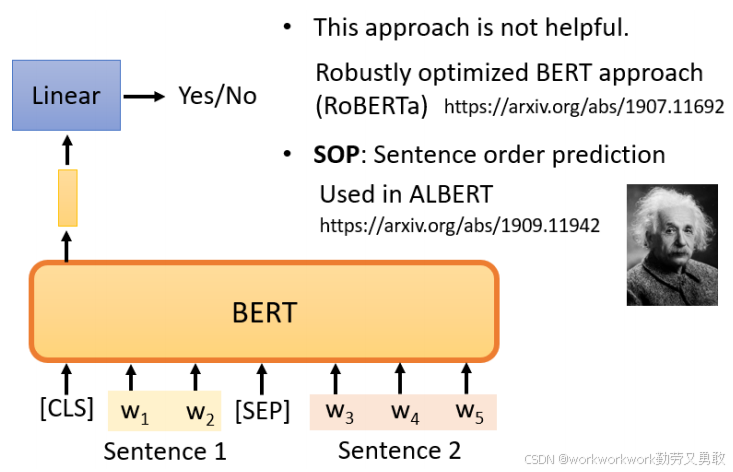 不过后续研究(如 RoBERTa 等)指出 NSP 在很多下游任务中帮助有限,一些改进模型(如 ALBERT)采用了更困难的 Sentence Order Prediction(SOP)来替代 NSP。