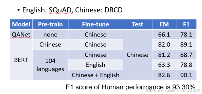 用BERT做多语言预训练后,真正训练时使用英文Q&A数据,测试时用中文Q&A,BERT依然能取得不错表现(F1高达78%)。
