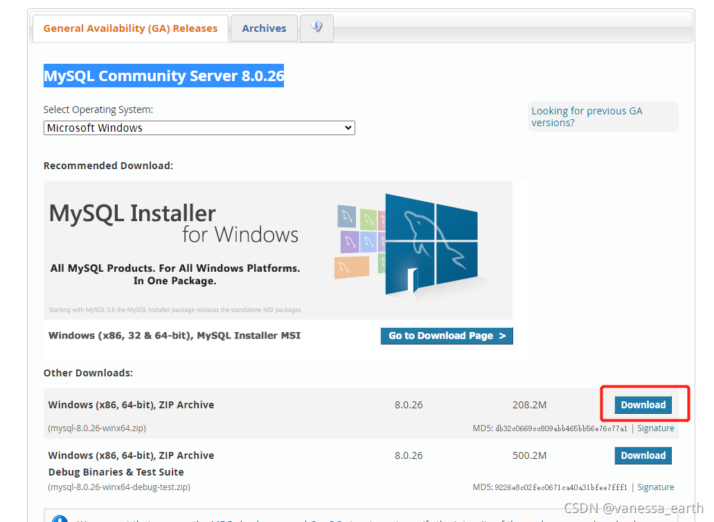 在MySQL官网下载服务:找到MySQL Community Server 8.0.26服务的下载地址:MySQL :: Download MySQL Community Server