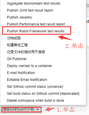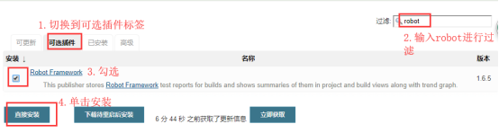 步骤:进入jenkins主页面,系统管理-管理插件-可选插件,在过滤窗口输入robot,安装Robot Framework插件
