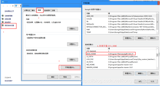 我的电脑-->右键-->属性,在弹出的窗口中按如图所示的顺序配置JAVA_HOME
