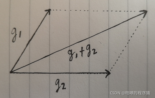 我们还可以这样理解,g1是一个坐标点,g2是一个移动向量,那么g1+g2就是将点g1按照g2的方向和距离进行移动,也就是新的位置点g3。使用向量代表物体的移动非常合适,向量的方向代表移动的方向,向量的长度代表移动的速度。