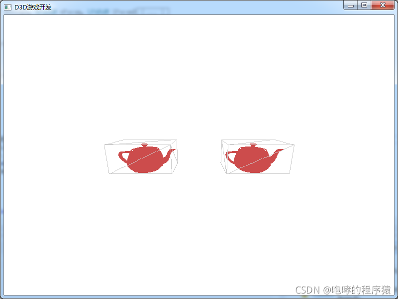 为了能够区分茶壶模型和碰撞盒模型,我们分别使用颜色和线框的方式来做区分,运行代码: