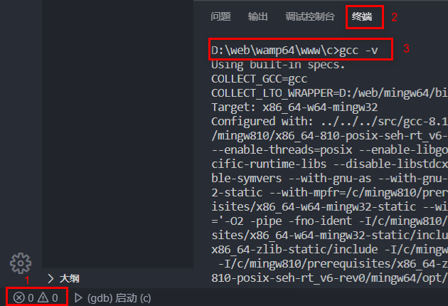 这时会得到一个".vscode"文件夹,里边有lauch.json文件,将其改成如下形式,注意“miDebuggerPath”的路径{ // 使用 IntelliSense 了解相关属性。 // 悬停以查看现有属性的描述。 // 欲了解更多信息,请访问: https://go.microsoft.com/fwlink/?linkid=830387 "version": "0.2.0", "configurations": [ { "name": "(gdb) 启动", "type": "cppdbg", "request": "launch", "program": "${workspaceFolder}/${fileBasenameNoExtension}.exe", "args": [], "stopAtEntry": false, "cwd": "${workspaceFolder}", "environment": [], "externalConsole": false, "MIMode": "gdb", "miDebuggerPath": "D:/web/mingw64/bin/gdb.exe",//你的mingw所在的文件夹,即编译器所在的文件夹 "setupCommands": [ { "description": "为 gdb 启用整齐打印", "text": "-enable-pretty-printing", "ignoreFailures": true } ] } ] }点击右下角,进入“终端”,输入"gcc -v",如果“终端”显示找不到gcc则需要重启电脑。