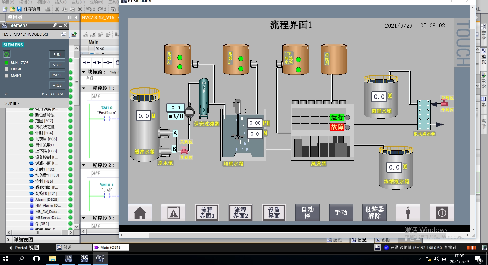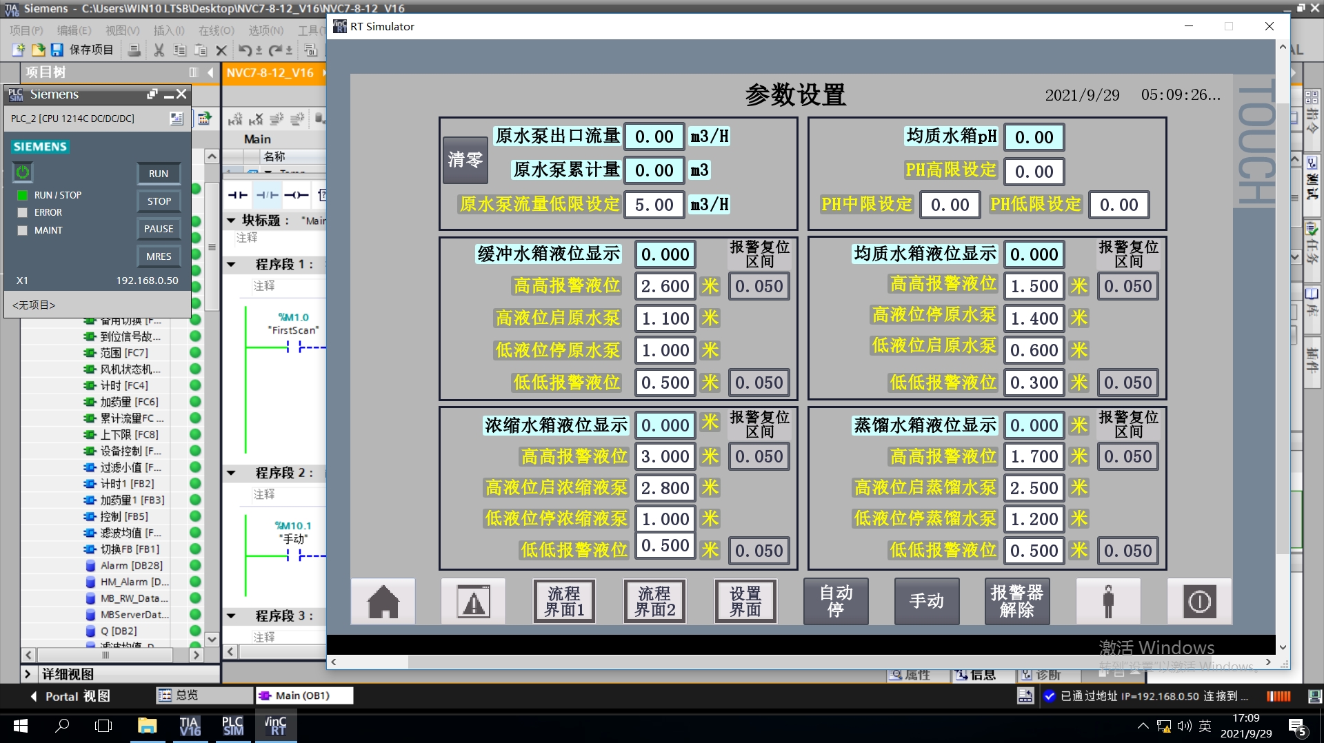 西门子水处理1200PLC程序+触摸屏程序,博图V16学习程序,可仿真实验