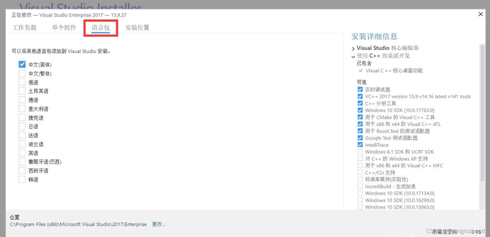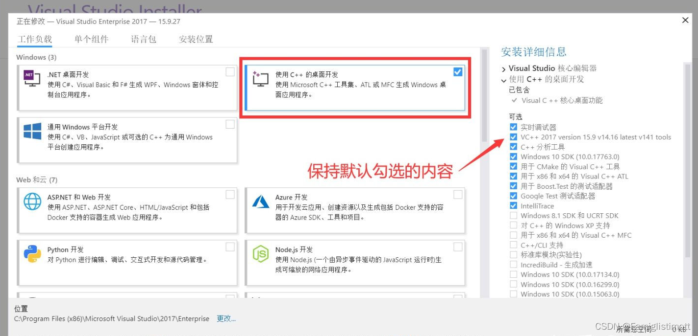 VS 2017 除了支持 C/C++ 开发,还支持 C#、F#、Visual Basic 等开发语言,我们没有必要安装所有的组件,只需要安装 “使用C++ 的桌面开发” 即可。