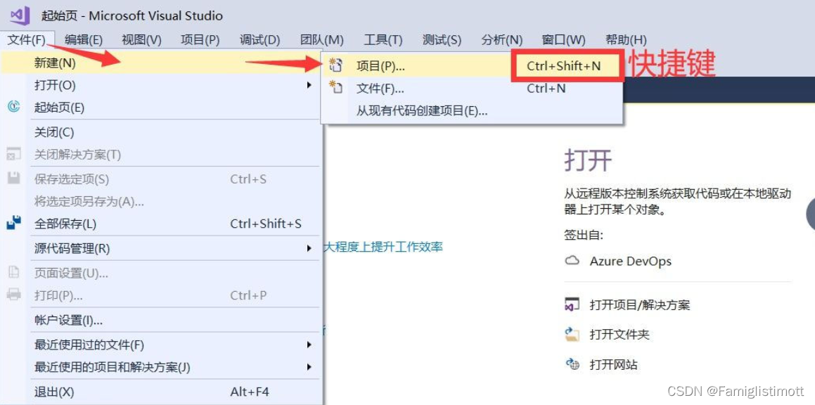 在菜单栏,选择【文件】→【新建】→【项目】(快捷键Ctrl+Shift+N)