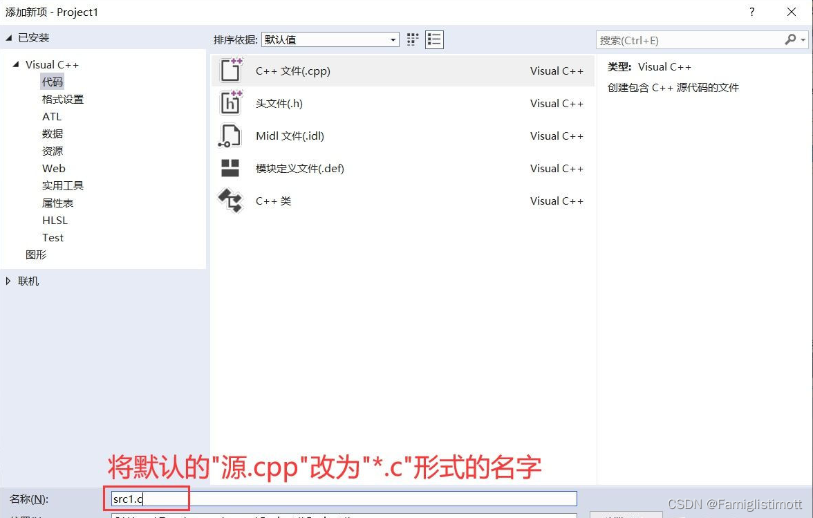 我们需要在底下手动修改文件后缀名,比如把文件名称改为src1.c(啥名字都行,但注意一定要连着后缀名一块改,VS的编译器可以辨认这是纯C代码),然后确认。