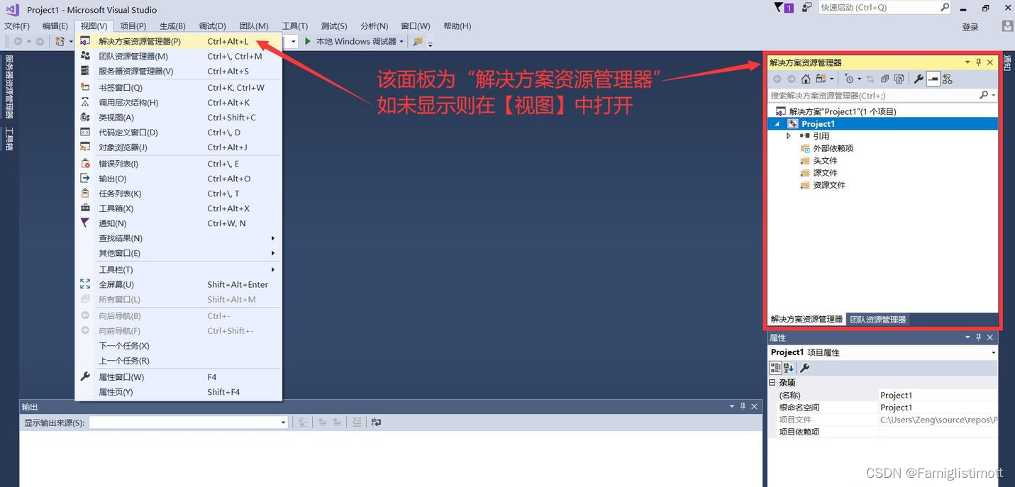 项目新建成功后,一般界面右侧为“解决方案资源管理器”(如果找不到,点击【视图】→【解决方案资源管理器】将其唤出,快捷键Ctrl+Alt+L),在其中你可以看到我们创建的Project1项目被自动置入到了一个同名的解决方案中。