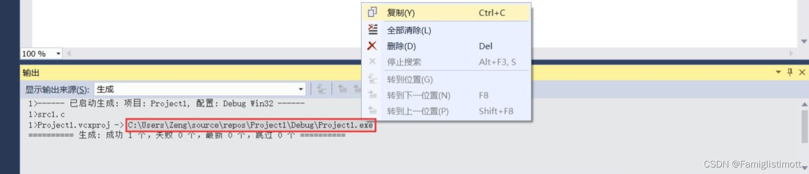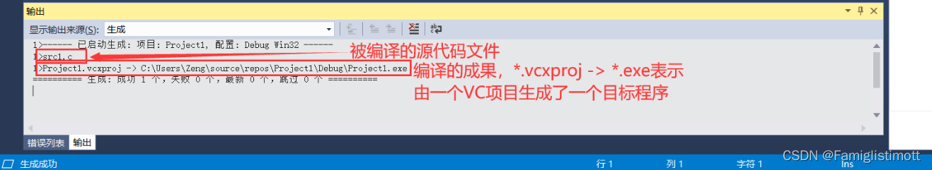 生成过程中,你将在下面“输出”面板中看到一些信息。如果你的程序包含错误,这里则会输出不一样的信息,详情可点击左侧“错误列表”查看。
