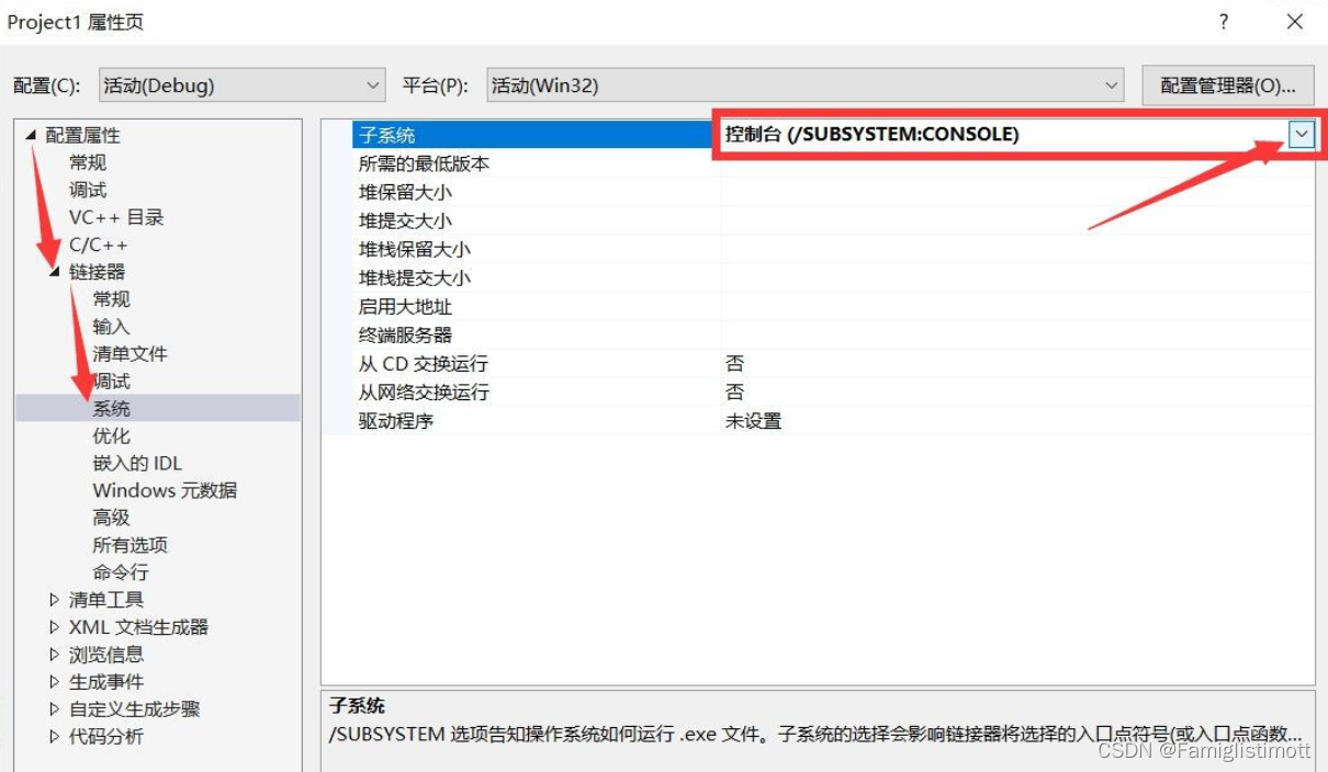 在属性页左侧展开【链接器】,选择【系统】,将右侧【子系统】项的值修改为“控制台”。确定退出。