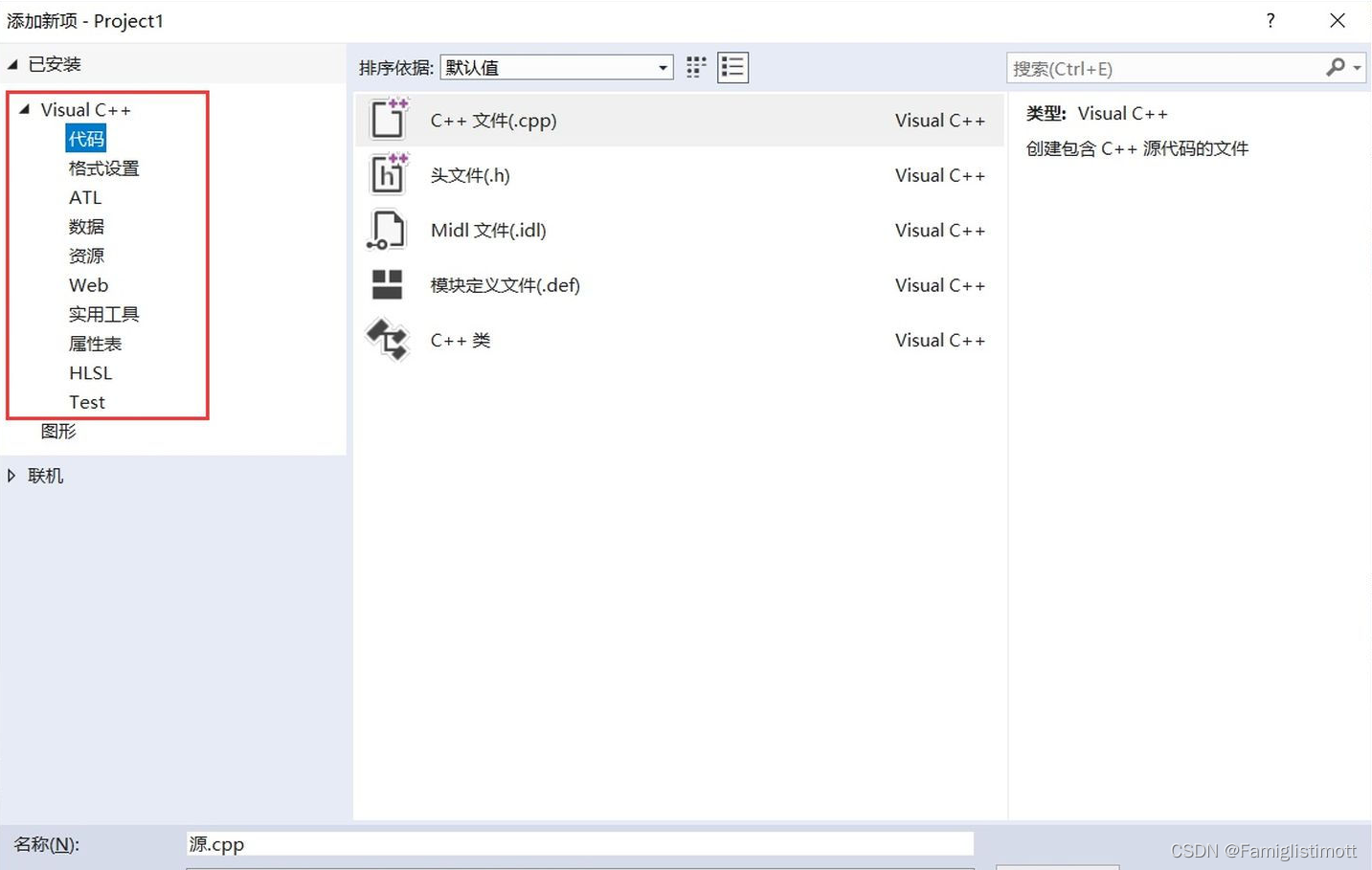 在弹出的【添加新项】对话框中,选择【Visual C++】一栏中的【代码】,你将看到C++项目支持的各种类型的代码文件。常用的C++代码格式是第一个,后缀名为.cpp,这里并没有列出纯C要用的.c格式。