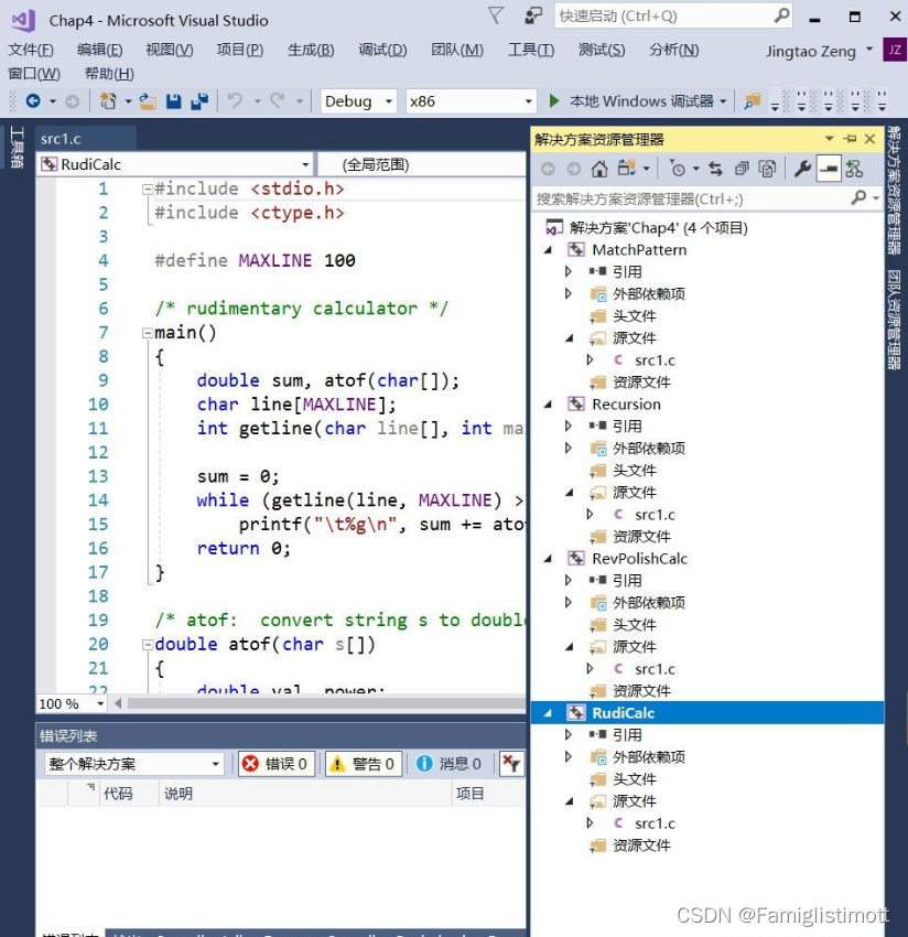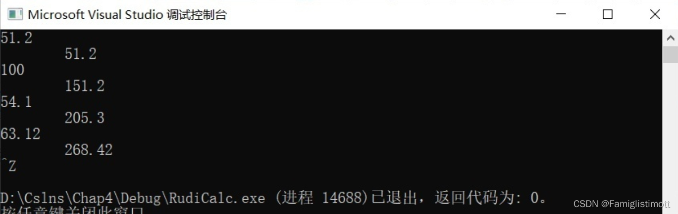 确定回到代码页,在我们当前RudiCalc项目下,快捷键Ctrl+F5执行,此时其他无关项目被自动忽略,结果如下