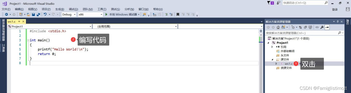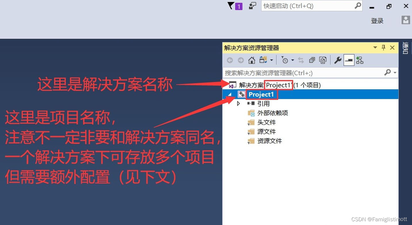 跟一些简单的编程环境不同,VS以一个项目作为我们编写程序的基本组织单元。它包含生成一个目标程序所需的所有源代码和各种资源等,也会存储该项目编写和生成过程中的诸多中间信息和日志。而解决方案,则又是项目的容器,它允许我们将多个相关或有依赖的项目组织在一起,方便高效处理。