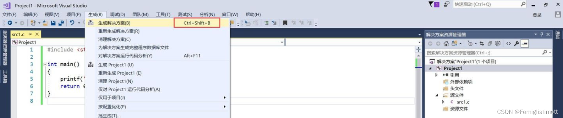要生成该项目的目标程序(也就是Window上最常见的.exe程序),一般是选择菜单栏中的【生成】→【生成解决方案】