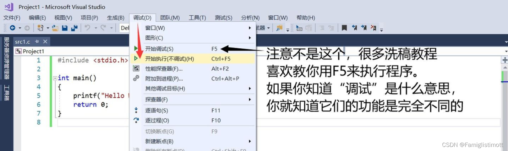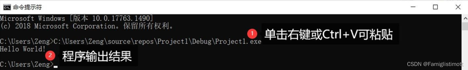 当然,在VS这样强大的IDE里显然不需要这样复制粘贴来执行程序(但新手应该知道这种没有图形界面的程序本质上是如何运行的!),我们只需选择菜单栏中的【调试】→【开始执行(不调试)】(快捷键Ctrl+F5)。