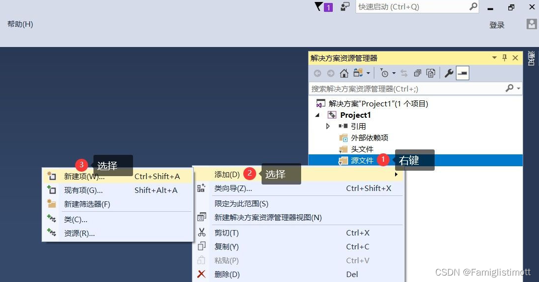 右键项目名称下的【源文件】,选择【添加】→【新建项】(快捷键Ctrl+Shift+A)