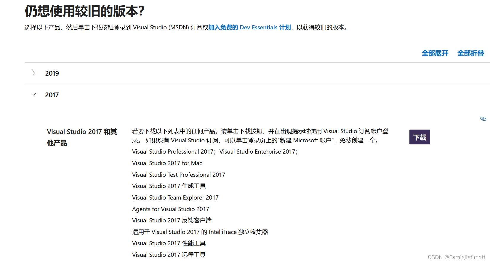 不过现在下载旧版本需要微软账号并注册Dev Essentials计划,而且考虑到微软这类冷门服务连接起来着实费劲,故我这里放一个VS 2017的直接下载链接(右键复制到浏览器地址栏或下载器中即可)