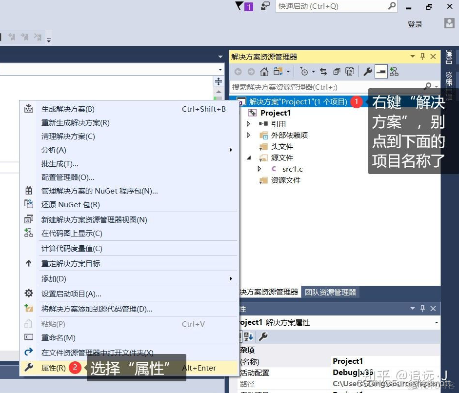 右键解决方案的图标,选择【属性】,