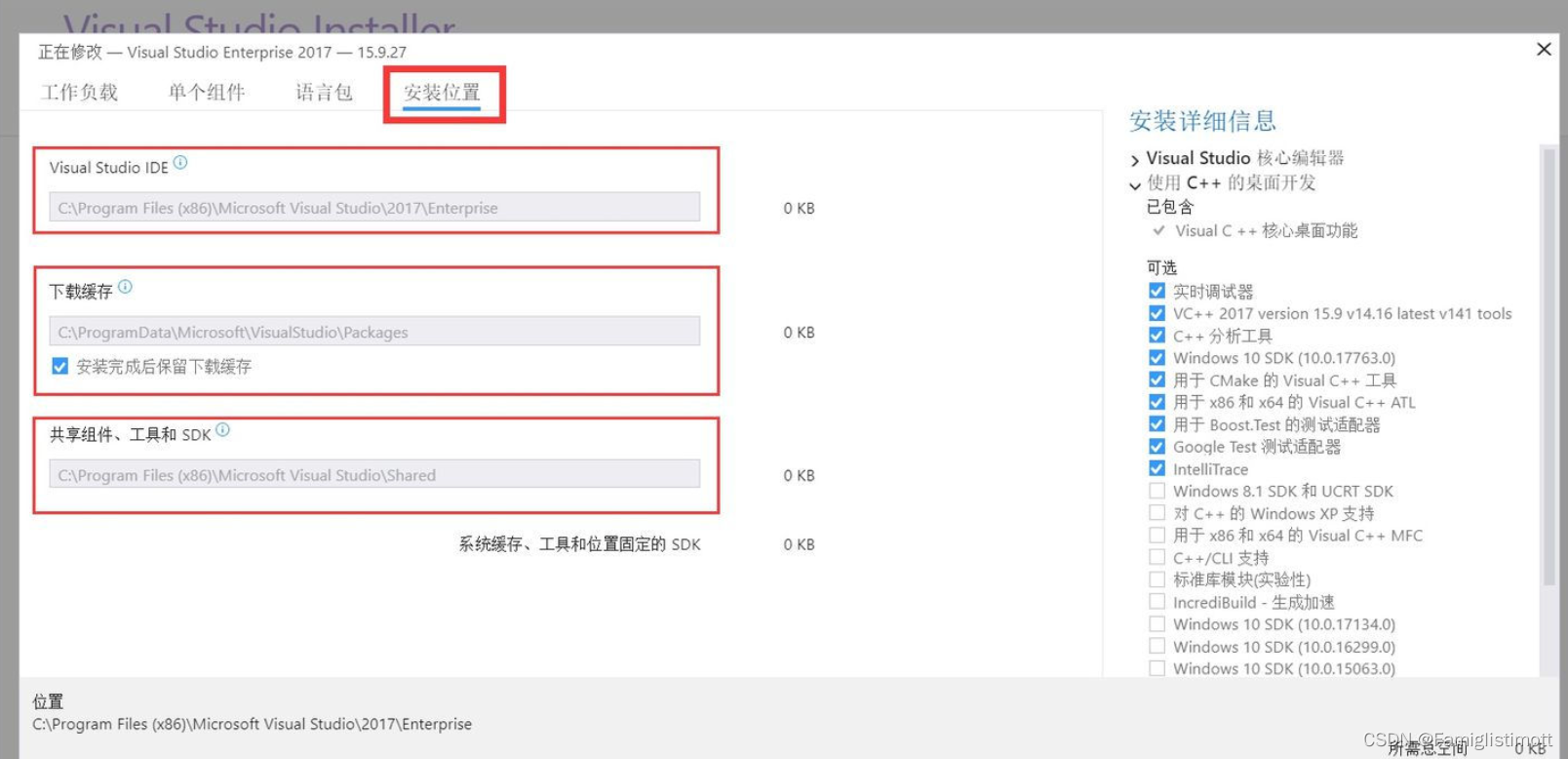 同时在这个页面,还可以选择 VS 2017 的存储位置,也可选择其他盘。然后直接点击安装,安装过程可能需要一段时间,大家耐心等待。