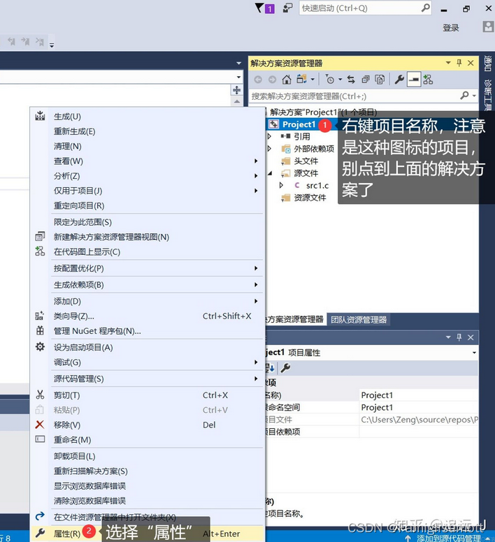 某些情况下即使使用了Ctrl+F5正常执行,也可能遇到一闪而过的情况(VS 2017最新版不会有这种情况,建议升级),这时需要一个额外的设置。在“解决方案资源管理器”中,选择我们的项目(注意是那个带两个加号的项目图标,不是解决方案的图标),然后右键,选择【属性】,